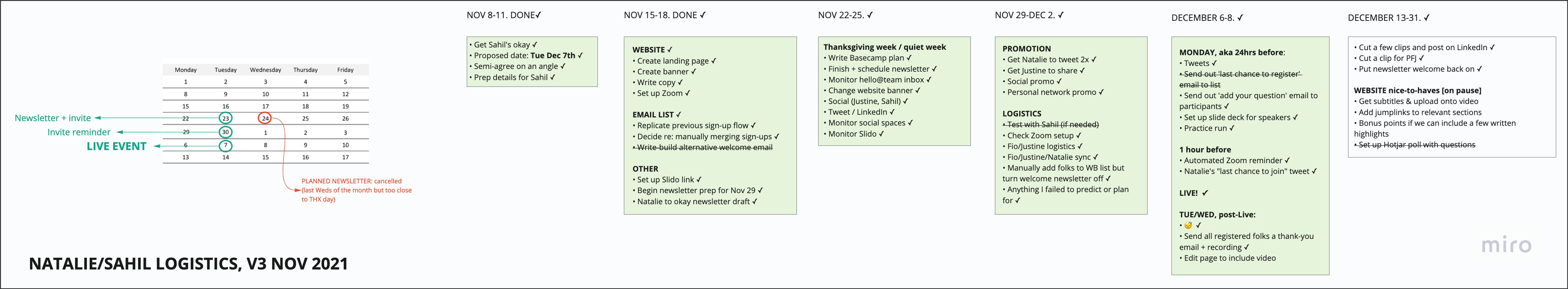 Last year, I planned an online event at Wildbit. I built a Miro board with a rectangular block for each week that separated us from the event (the five green blocks you see below), then I started working backwards from the time of the event itself.